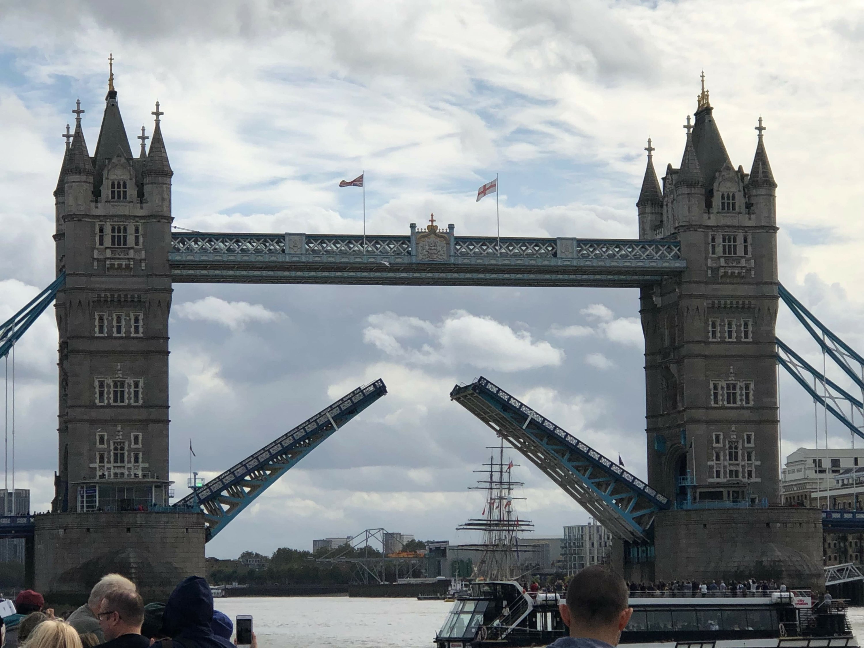 Beside the bridge was the Tower of London, where the Crown Jewels are kept. It is a magnificent fort looking property, where the Beefeaters offer tours, which we did not do but will if we ever come back. Halfway through the tour we hopped off (see how that works) the bus and went on a river cruise on the Thames River, where luckily enough a large sailboat was on and we got to see the Tower Bridge being raised.