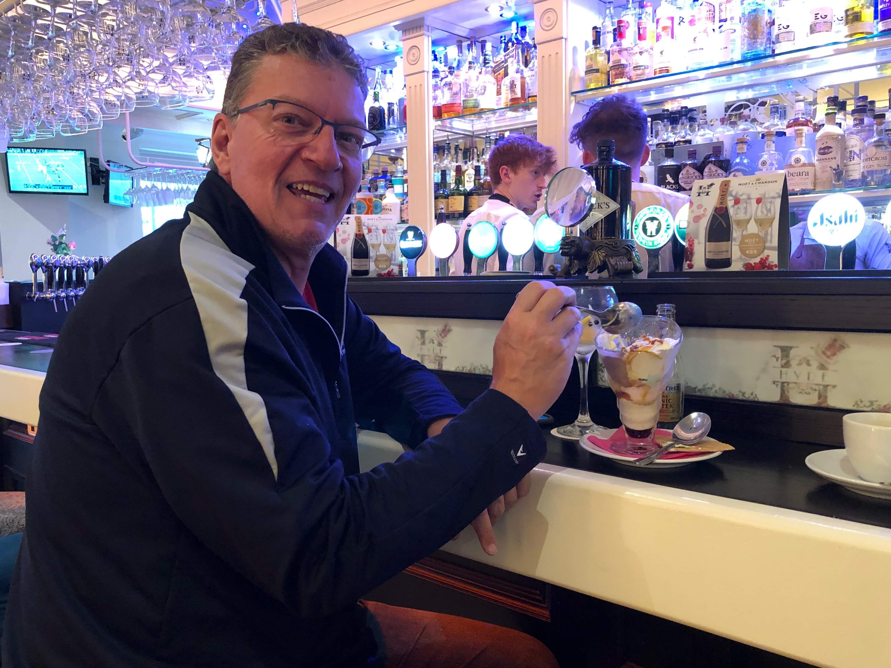 After we checked in, we went to look for the train station so we knew where we were going come Tuesday morning, when we would be traveling to Belfast. As it turned out, it was one block from the hotel which will make it very convenient! Next we went for a stroll up the street with all of the shops, stopping in the Skechers store to try and feed my other addiction – shoes! (I already bought one pair of Skechers on this trip). Without buying a pair of shoes, we next went down to the end of the street to find a place to eat. We settled on a small little restaurant – Quay Street Kitchen that had very good food. After dinner we sauntered back to our hotel pub for my other addiction – a G&T – but I added an ice cream sundae to hide the booze!